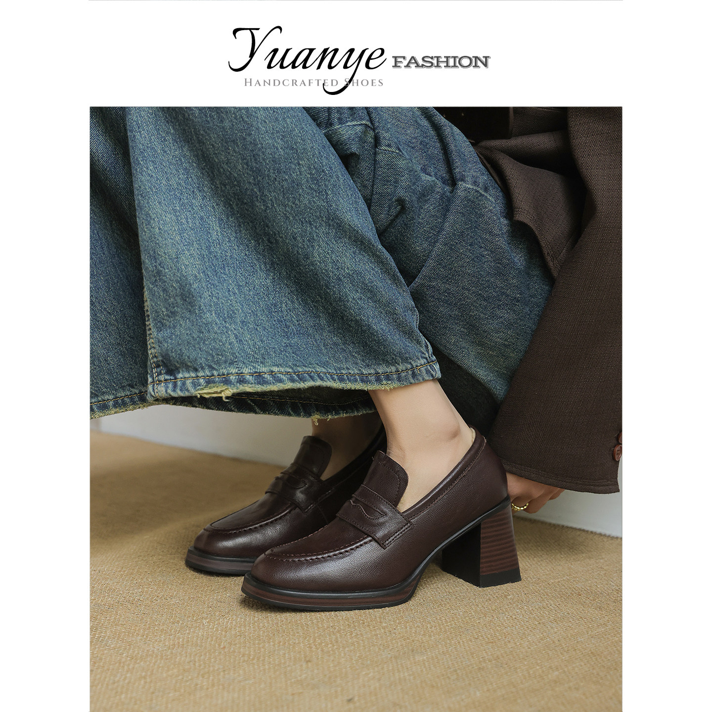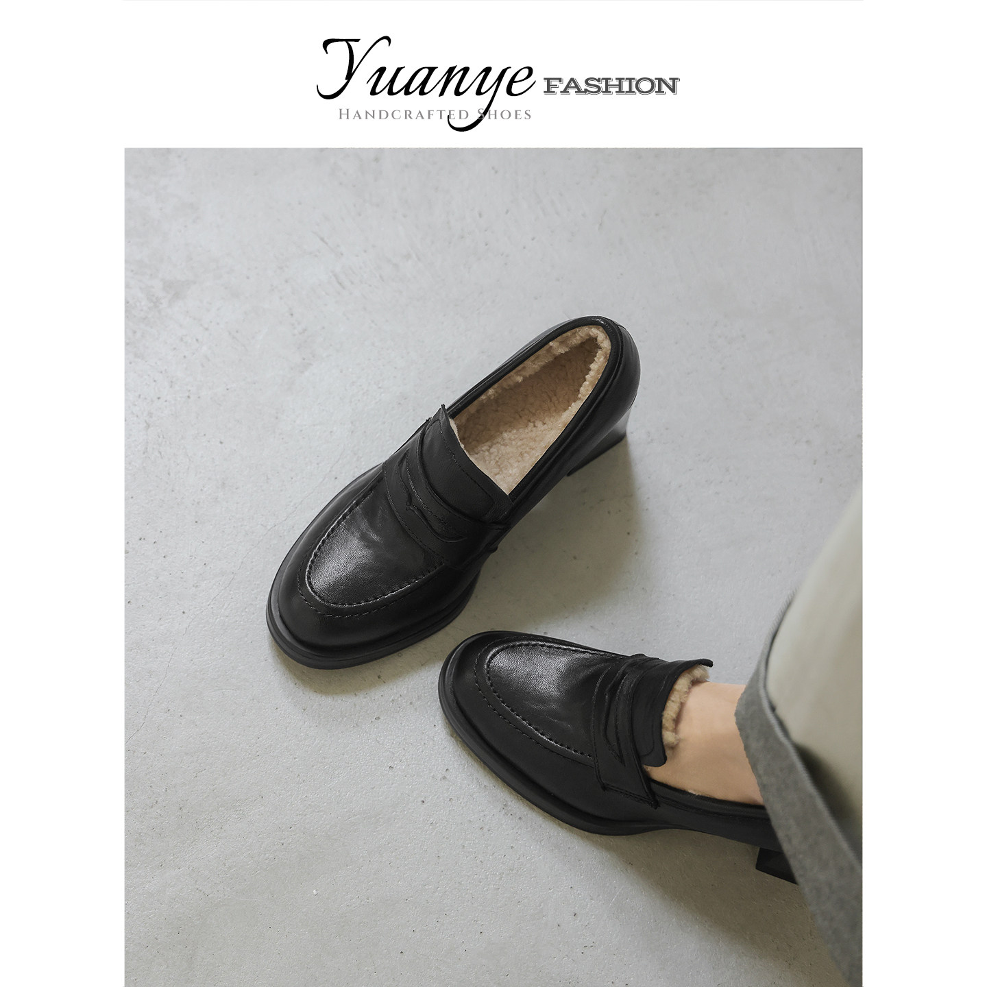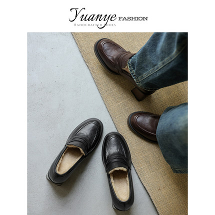 原野Yuanye●芬兰雾!真皮圆头加绒乐福鞋女秋冬新款粗跟高跟单鞋