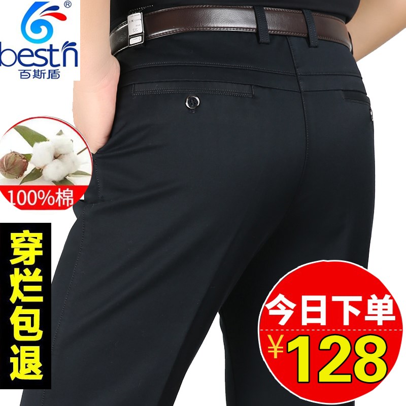 百斯盾白色休闲裤男纯棉商务裤中年抗皱免烫西裤高弹力裤夏季薄款