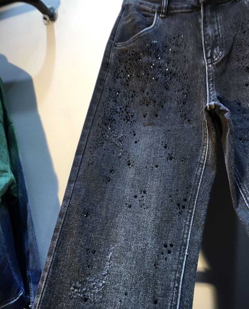高温烫钻高腰显瘦弹力直筒牛仔裤