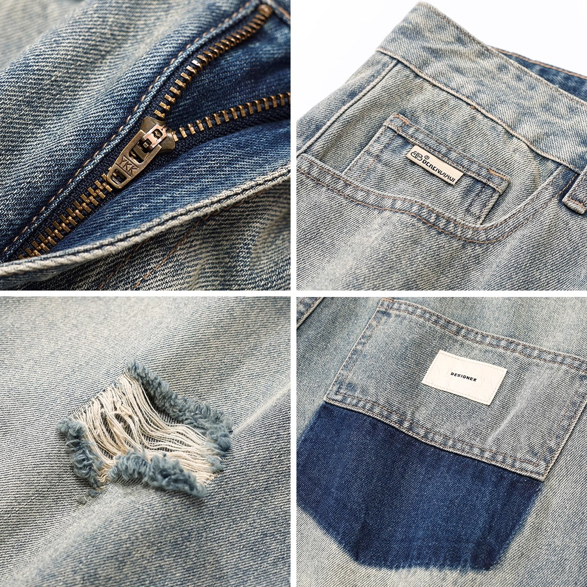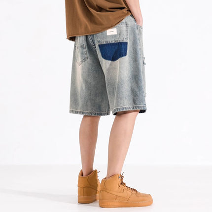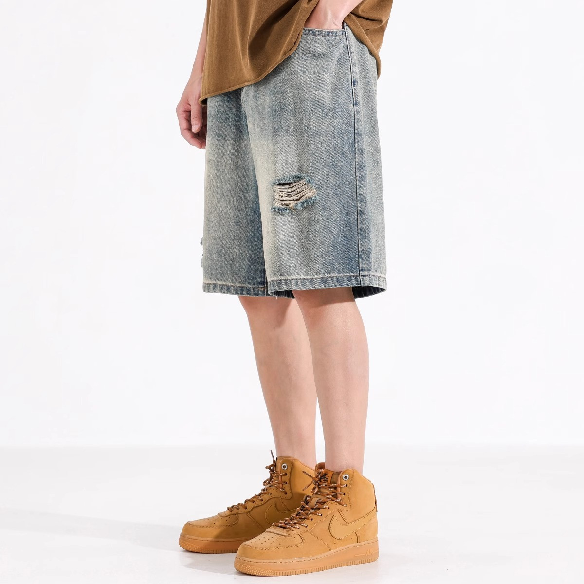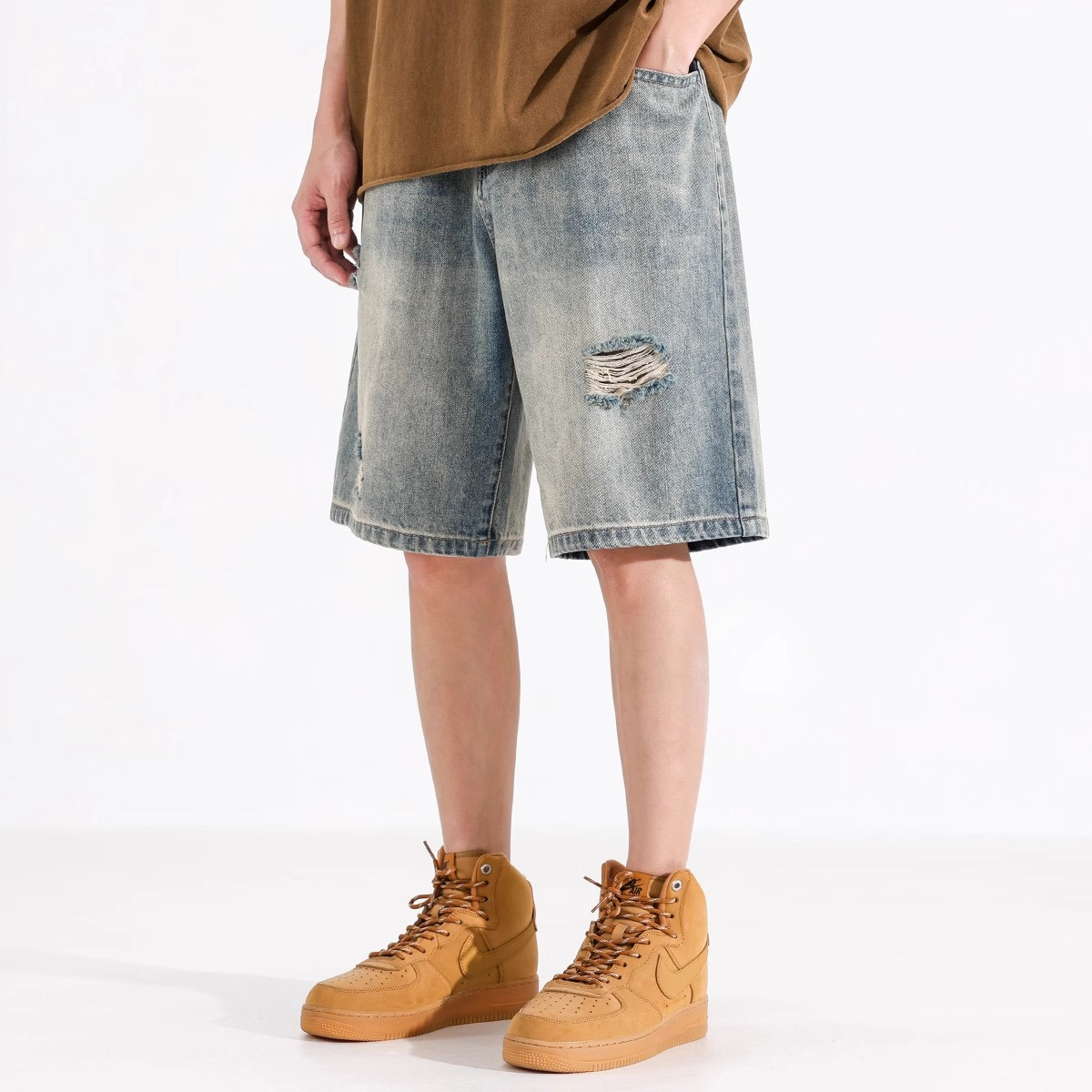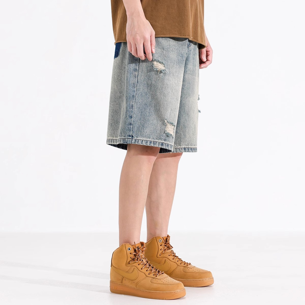 复古做旧破洞牛仔短裤男夏季新款宽松直筒中裤薄款休闲五分裤潮流