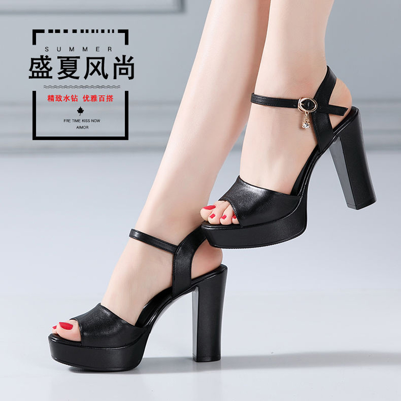 夏季新款韩版鱼嘴百搭防水台超高跟凉鞋女一字扣粗跟时尚走秀鞋子