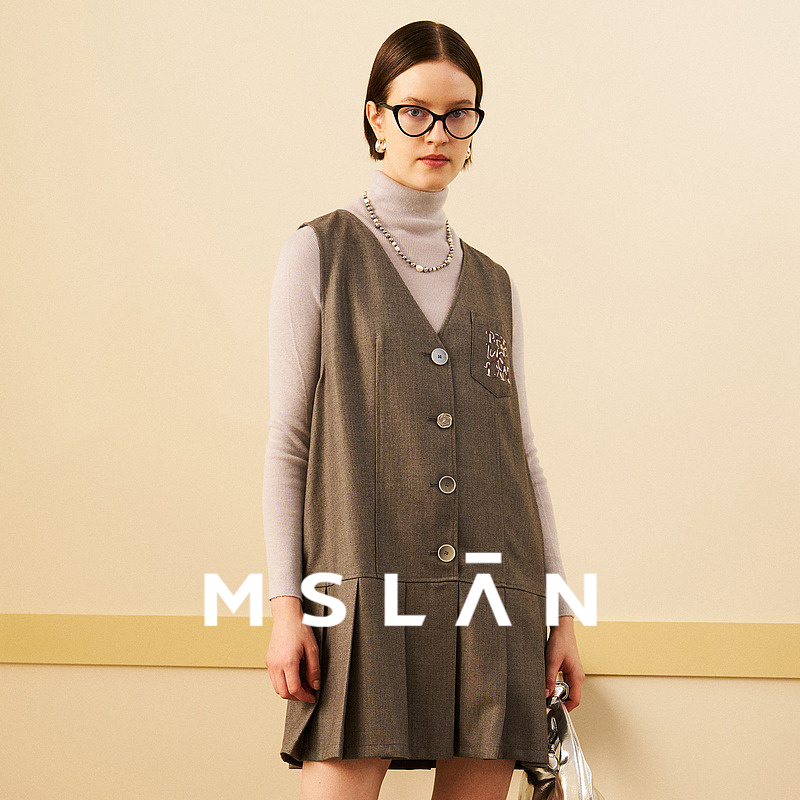 MSLAN秋冬miu系背心裙学院风V领压褶连衣裙MEDA4107
