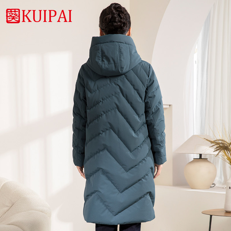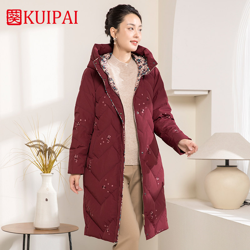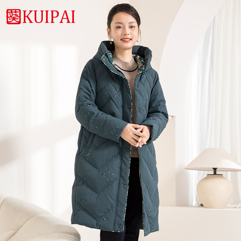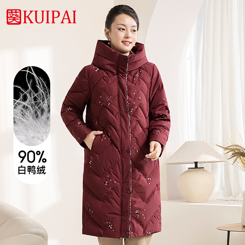 葵冬新款常规袖中长款90白鸭绒中老年女装妈妈装羽绒服连帽外套