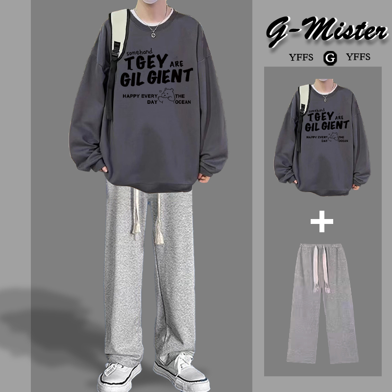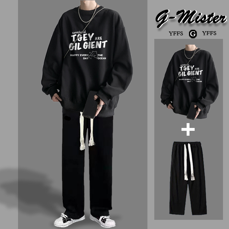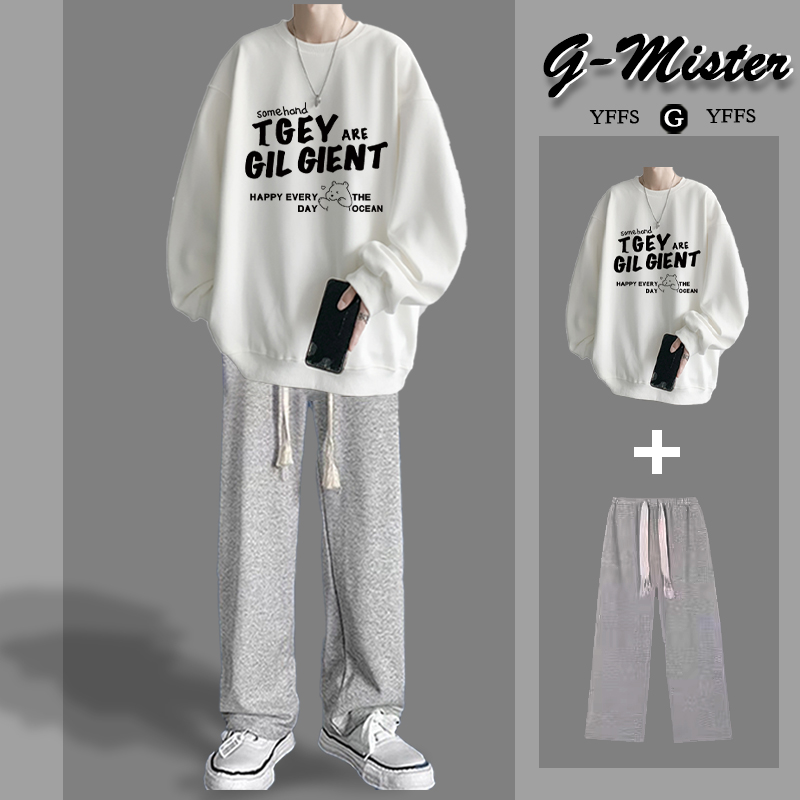 秋冬季圆领卫衣套装男生帅气t恤搭配直筒裤ins潮流港风男装两件套
