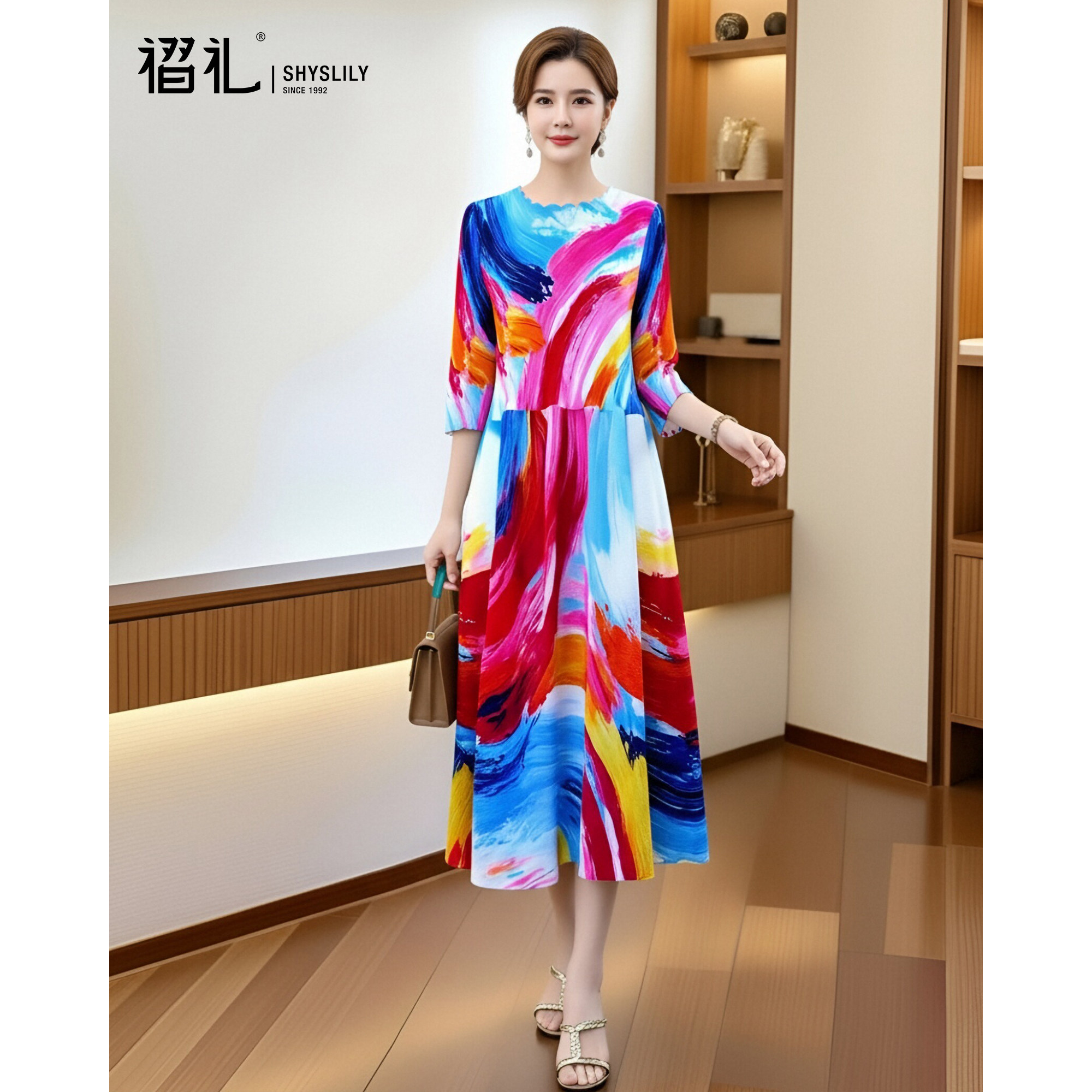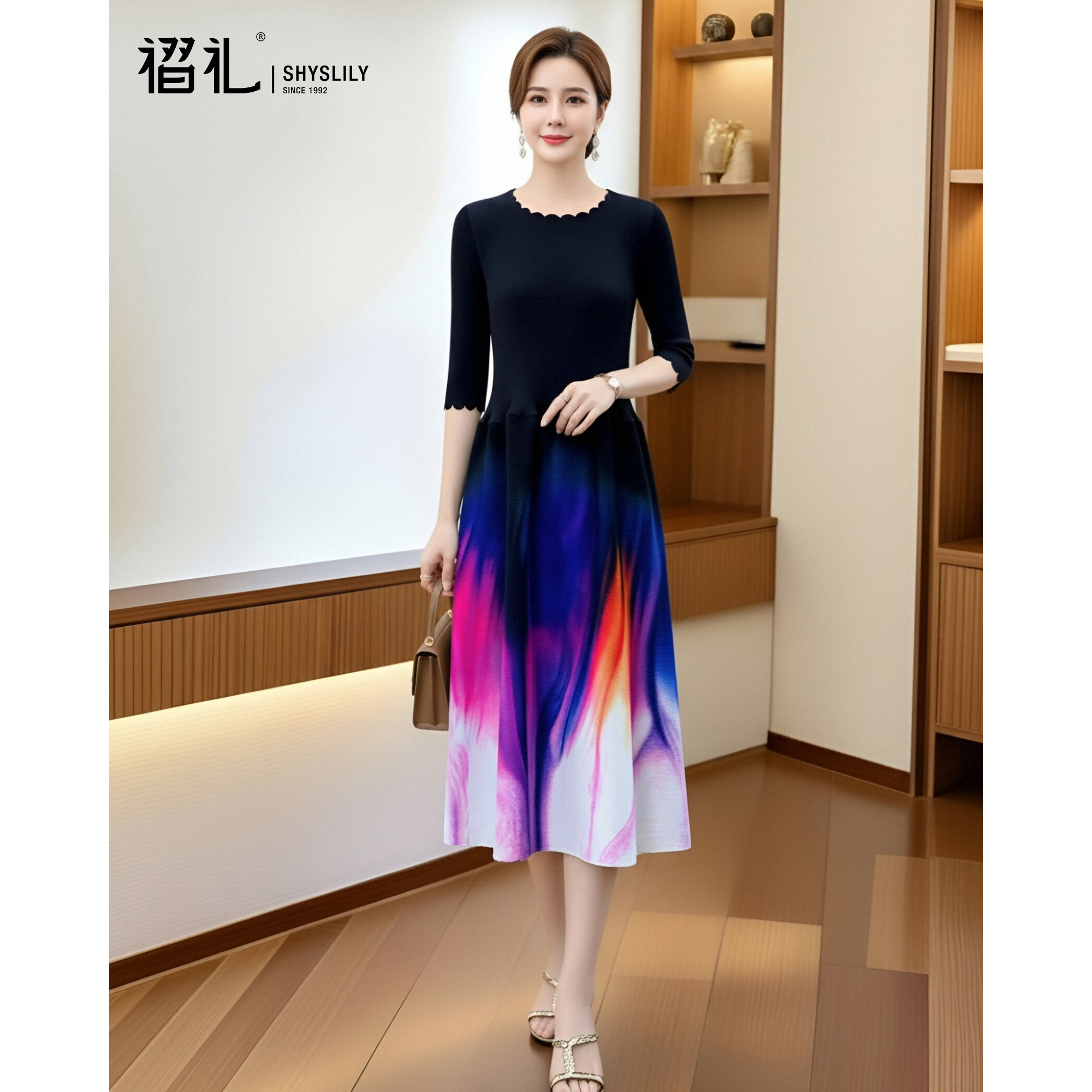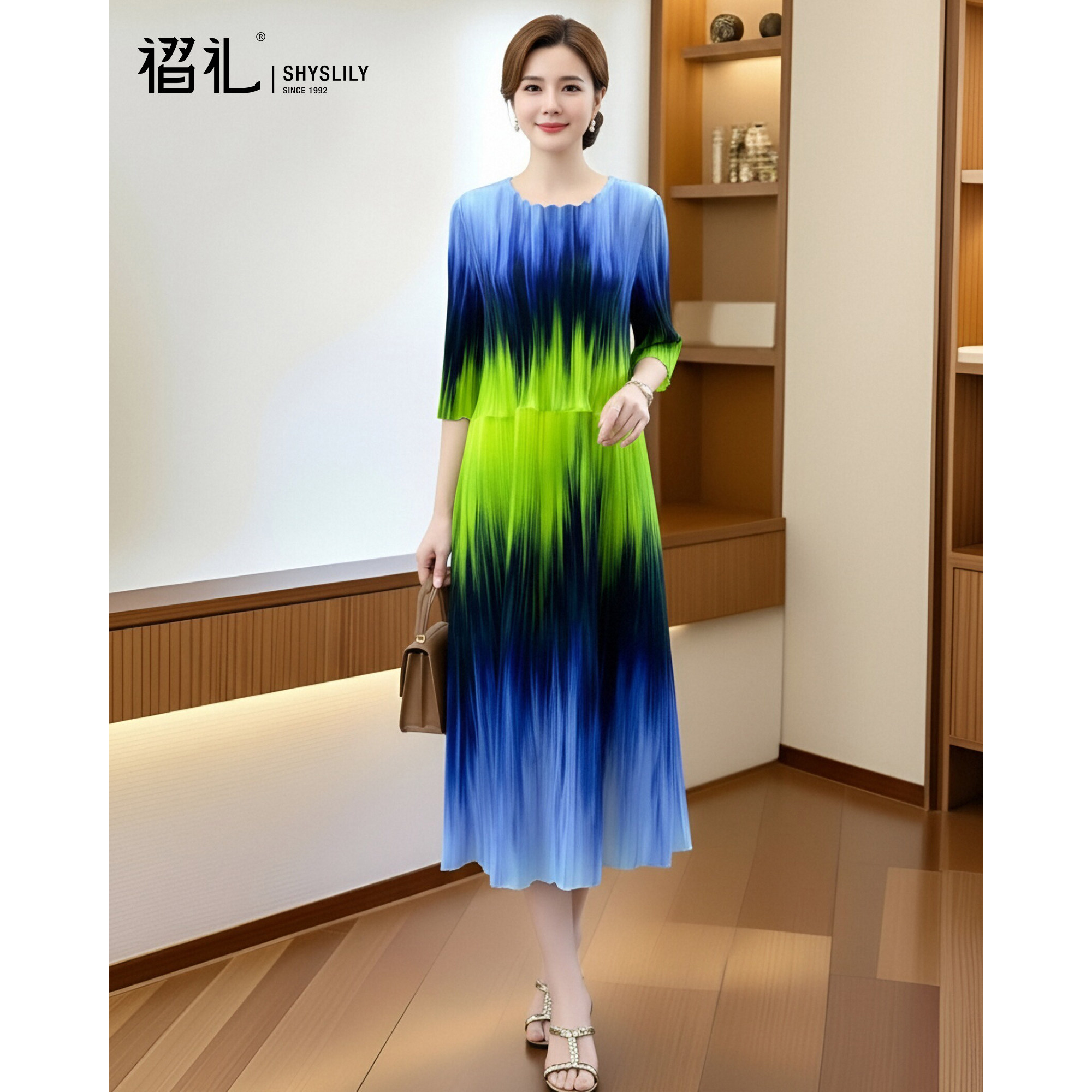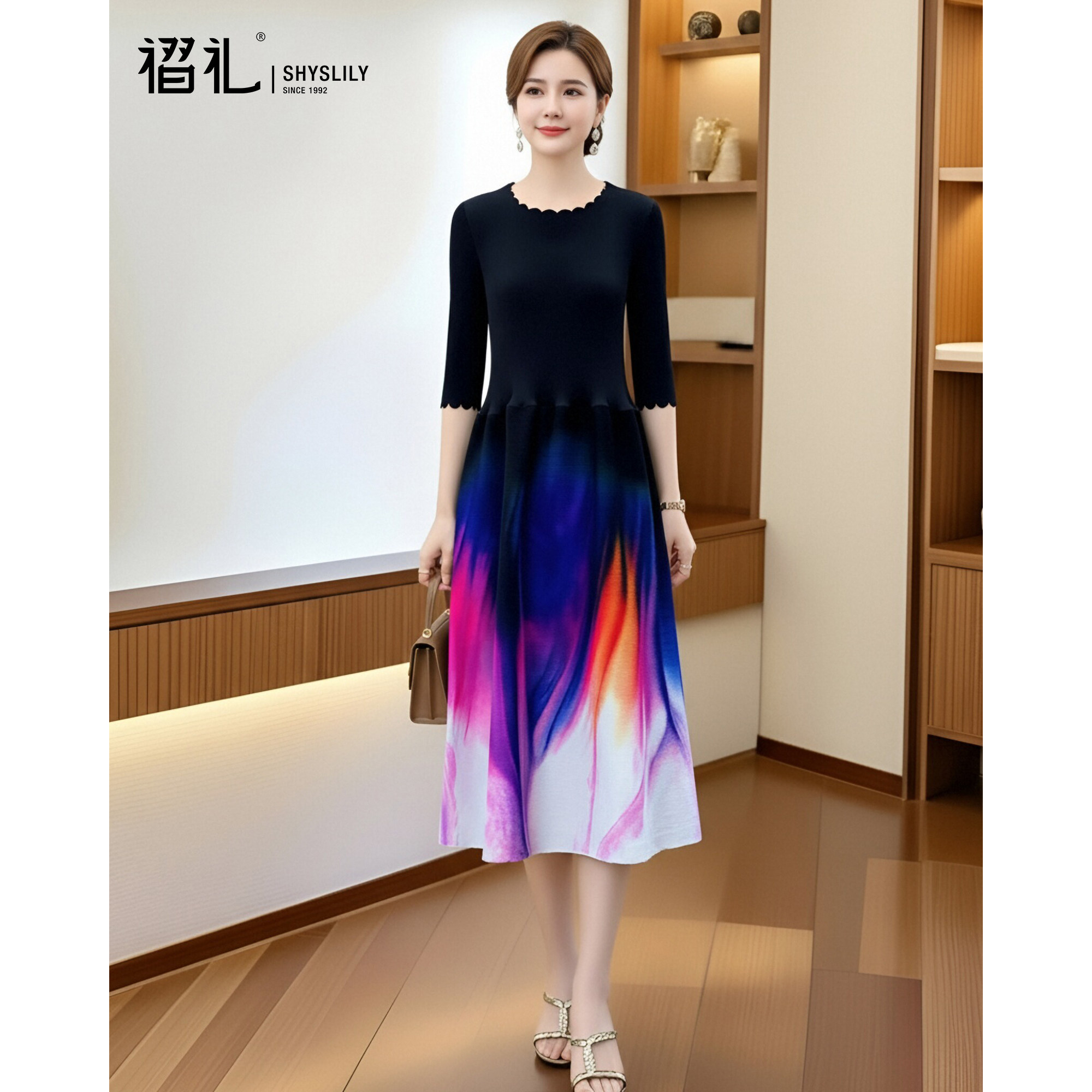 三宅褶皱晕染印花连衣裙时尚设计感中长裙高级感气质女装春装新款