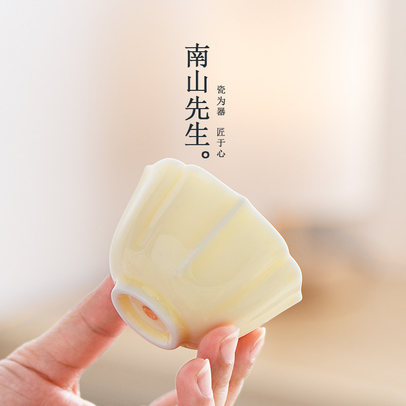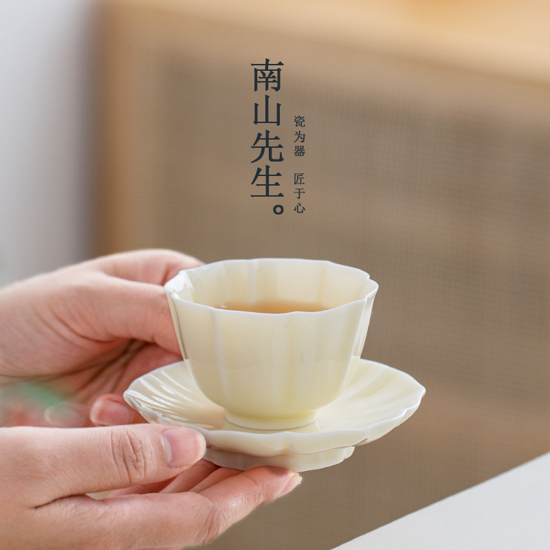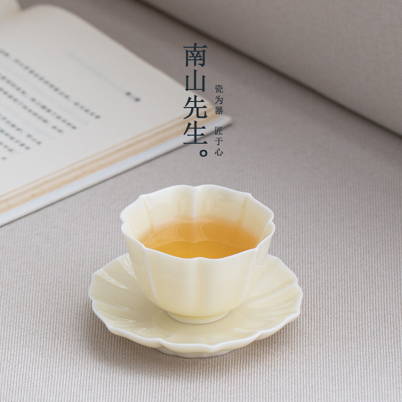 南山先生 月光白花瓣主人杯家用喝茶杯子带杯垫个人专用陶瓷茶杯