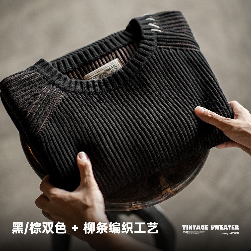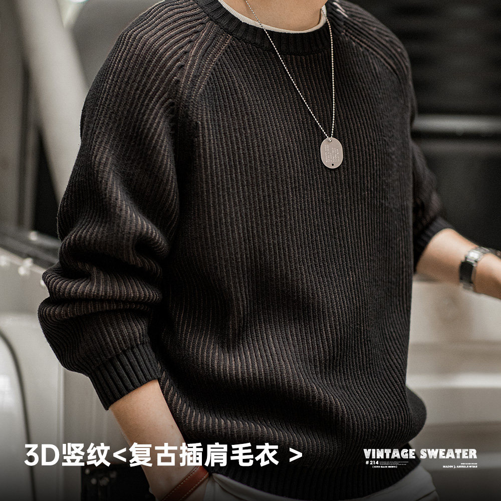 马登工装美式复古竖条纹编织毛衣插肩袖圆领加厚打底针织衫男春