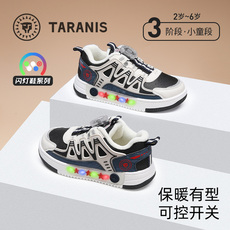 泰兰尼斯冬季新款儿童板鞋加绒保暖女童旋钮休闲鞋防滑软底闪灯鞋