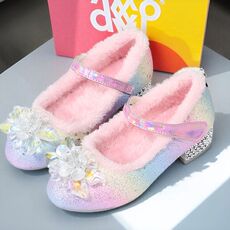 女童公主鞋秋冬季加绒高跟水晶鞋女孩软底保暖棉鞋儿童彩色小皮鞋