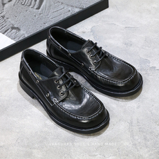 优100马皮宽版手工帆船鞋复古水洗大头浅口系带德比男休闲皮鞋黑