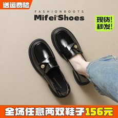 小金币厚底乐福鞋女一脚蹬懒人单鞋黑色英伦小皮鞋大码女鞋41到43