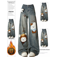 特大码女装胖mm美式复古加绒牛仔裤女秋冬加厚显瘦弹力阔腿长裤子