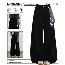 大码女装黑色阔腿牛仔裤女胖mm设计感卡通刺绣美式宽松直筒长裤子