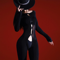 辣妹日记CL「墨心」交叉挂脖连体衣女高级性感长袖丝滑油亮紧身衣