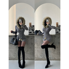 YoungGirlDay纯欲辣妹性感毛领连帽抽绳单排扣长袖针织连体衣短裤