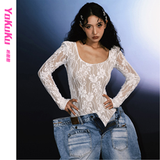 纯欲辣妹设计感U领长袖提花蕾丝连体上衣收腰修身性感内搭打底衫