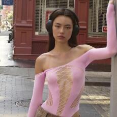 千禧辣妹风镂空烫钻一字肩长袖上衣Y2K性感修身显瘦内搭连体衣女