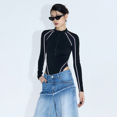 ourhour 反光条分割 黑色半拉链机车风紧身连体衣 女冬设计感上衣