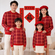2026马年亲子装一家三口四口圆领加厚毛衣母女母子装红色拜年服