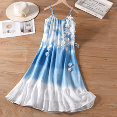 云南大理手工扎染法式立体花朵连衣裙女童亲子装夏新度假风吊带裙