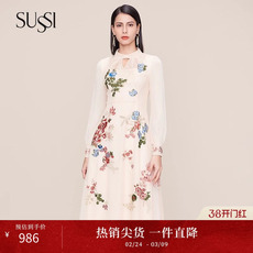 SUSSI/古色奥莱折扣店冬季新品商场同款杏色刺绣灯笼袖连衣裙