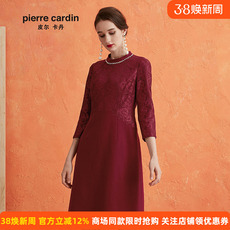 商场同款皮尔卡丹女装蕾丝拼接羊毛毛呢红色长袖连衣裙
