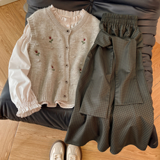 初春减龄一整套穿搭!学院风花朵针织马甲女叠穿衬衫半身长裙套装