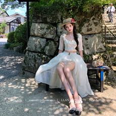 你的懒懒llan【夏日绵绵冰】浪漫甜美套装女U领泡泡袖上衣+半裙