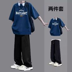 春秋美式复古假两件夹克套装男青少年潮牌宽松痞帅休闲运动套装