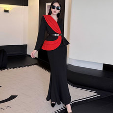 春季新款撞色设计感荷叶边长袖薄外套时尚套装气质高腰裙两件套女