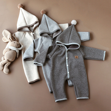 婴姿婴儿连体衣软糯A类男女宝宝长袖连身爬服连帽薄绒春秋外出服