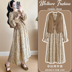孕妇连衣裙套装春秋2026新款韩版孕妈卡其色气质马甲碎花裙两件套
