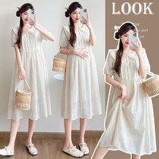 孕妇装泡泡袖A字夏季新款两色初恋气质孕妈妈不显怀连衣裙