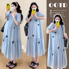 孕妇连衣裙夏装新款潮妈宽松外出洋气亮闪闪蝴蝶裙子中长款遮肚夏