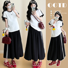 孕妇套装夏季2026新款时尚洋气黑色薄款短袖斜肩上衣裤子两件套