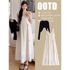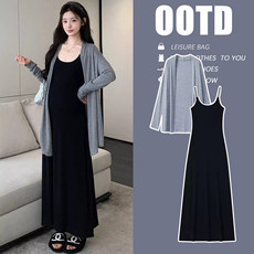 孕妇连衣裙套装春秋2025新款慵懒风潮妈灰色开衫拼接背心裙两件套