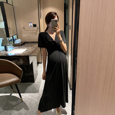孕妇夏装短袖气质宽松连衣裙长款2025韩版新款夏季孕妇装黑色裙子