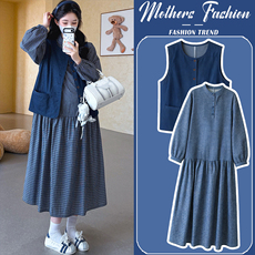 孕妇连衣裙套装春秋2026新款韩版孕妈减龄牛仔马甲格子裙两件套女