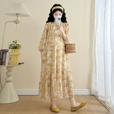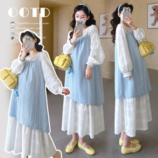 孕妇装春季新款蕾丝拼接法式圆领长袖孕妇连衣裙潮妈外出长款裙子