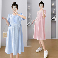 快乐屋全棉孕妇连衣裙夏装2026新款条纹衬衣裙潮妈孕妇裙子中长款
