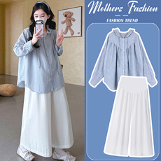 孕妇套装春秋2026新款蓝色条纹连帽潮妈洋气衬衫上衣阔腿裤两件套