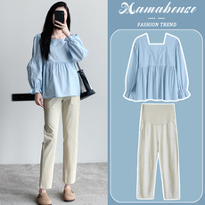 孕妇套装时尚洋气时髦蓝色潮妈方领上衣裤子两件套2024新款春秋装