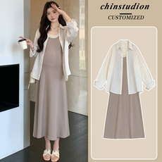 孕妇连衣裙套装春秋2025新款慵懒风潮妈灰色开衫拼接背心裙两件套