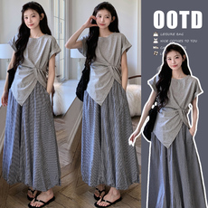孕妇夏季连衣裙套装休闲时尚宽松大码孕妇装遮肚条纹衬衫裙两件套
