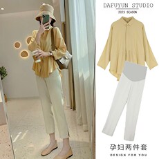 孕妇套装夏季2026新款时尚休闲杏色翻领薄款短袖上衣裙裤两件套女