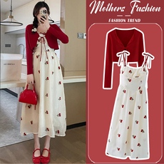 孕妇连衣裙套装春秋2026新款法式刺绣显瘦潮妈吊带裙开衫两件套女