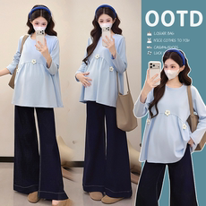 孕妇套装春秋2026新款时尚休闲浅灰色拼接长袖印花上衣裤子两件套