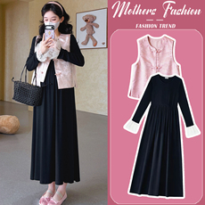 孕妇连衣裙套装春秋2026新款粉色甜美潮妈马甲新中式打底裙两件套