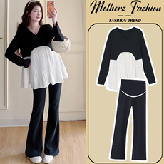 孕妇套装春秋2026新款时尚黑色拼接V领压褶娃娃衫上衣裤子两件套