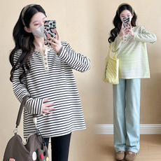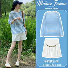 孕妇套装夏季2026新款休闲条纹宽松圆领薄款长袖防晒衫短裤两件套